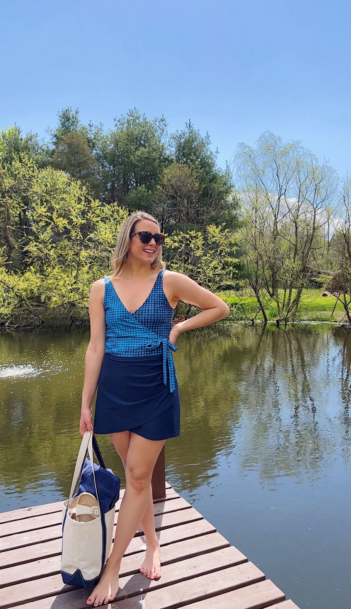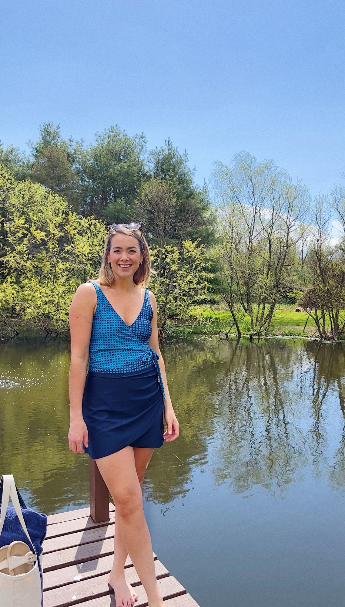 I love Summersalt’s one-pieces! They’re elegant, feminine, and a little flirty. And they have long torso options, which I love because I’m 5’10. I own several and for this collection, I received the Perfect Wrap One-Piece in the color Mixed Gingham in Calypso & Deep Sea. With the one piece, I’m wearing the Ruched Swimskirt in navy.